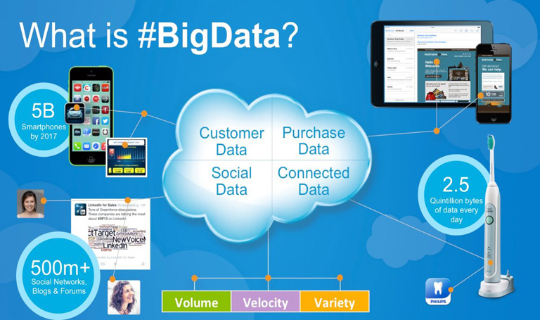 Data which are very large in size is called Big Data. Normally we work on data of size MB(WordDoc ,Excel) or maximum GB(Movies, Codes) but data in Peta bytes i.e. 10^15 byte size is called Big Data. It is stated that almost 90% of today's data has been generated in the past 3 years. Velocity: The data is increasing at a very fast rate. It is estimated that the volume of data will double in every 2 years. Variety: Now a days data are not stored in rows and column. Data is structured as well as unstructured. Log file, CCTV footage is unstructured data. Data which can be saved in tables are structured data like the transaction data of the bank. Volume: The amount of data which we deal with is of very large size of Peta bytes.